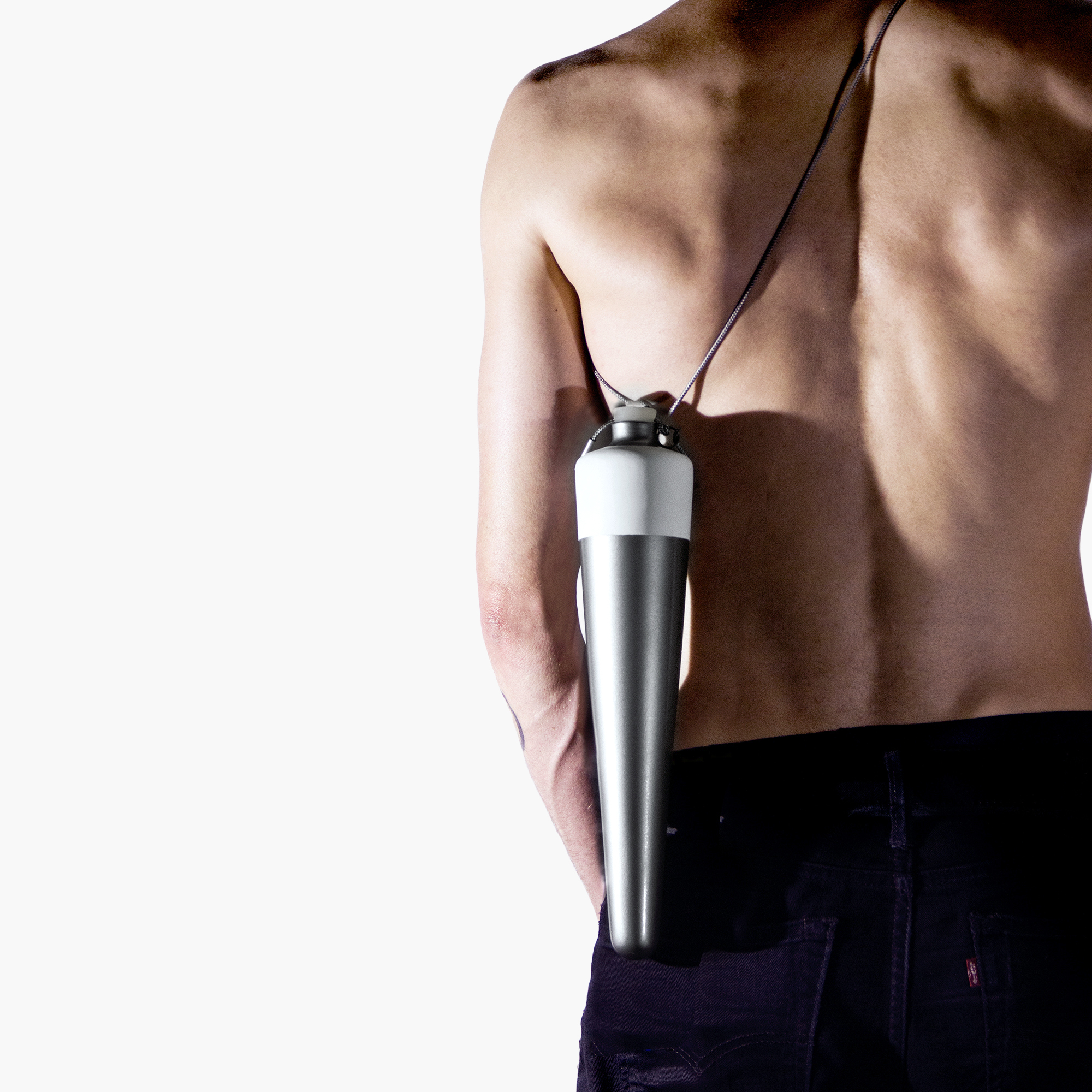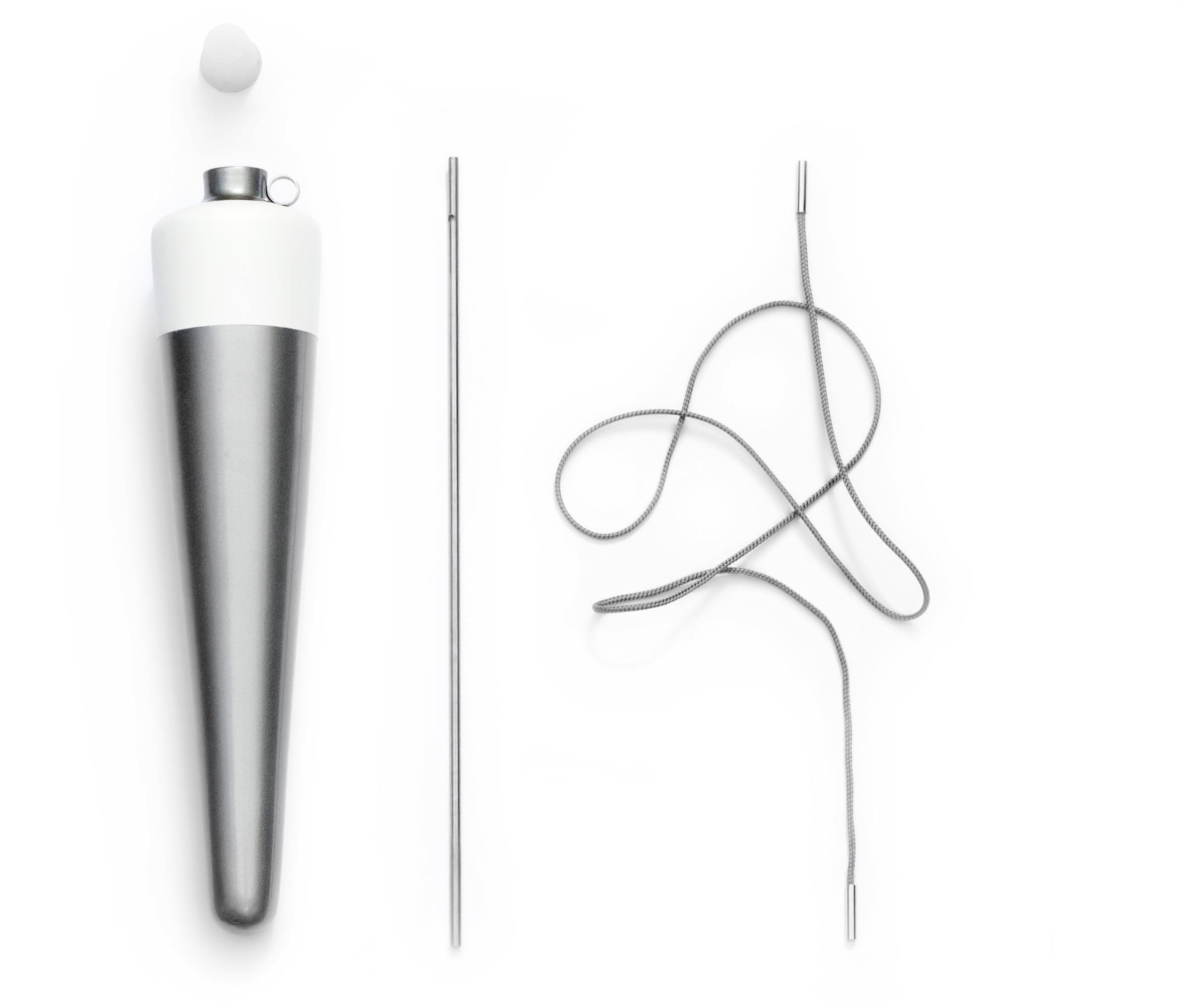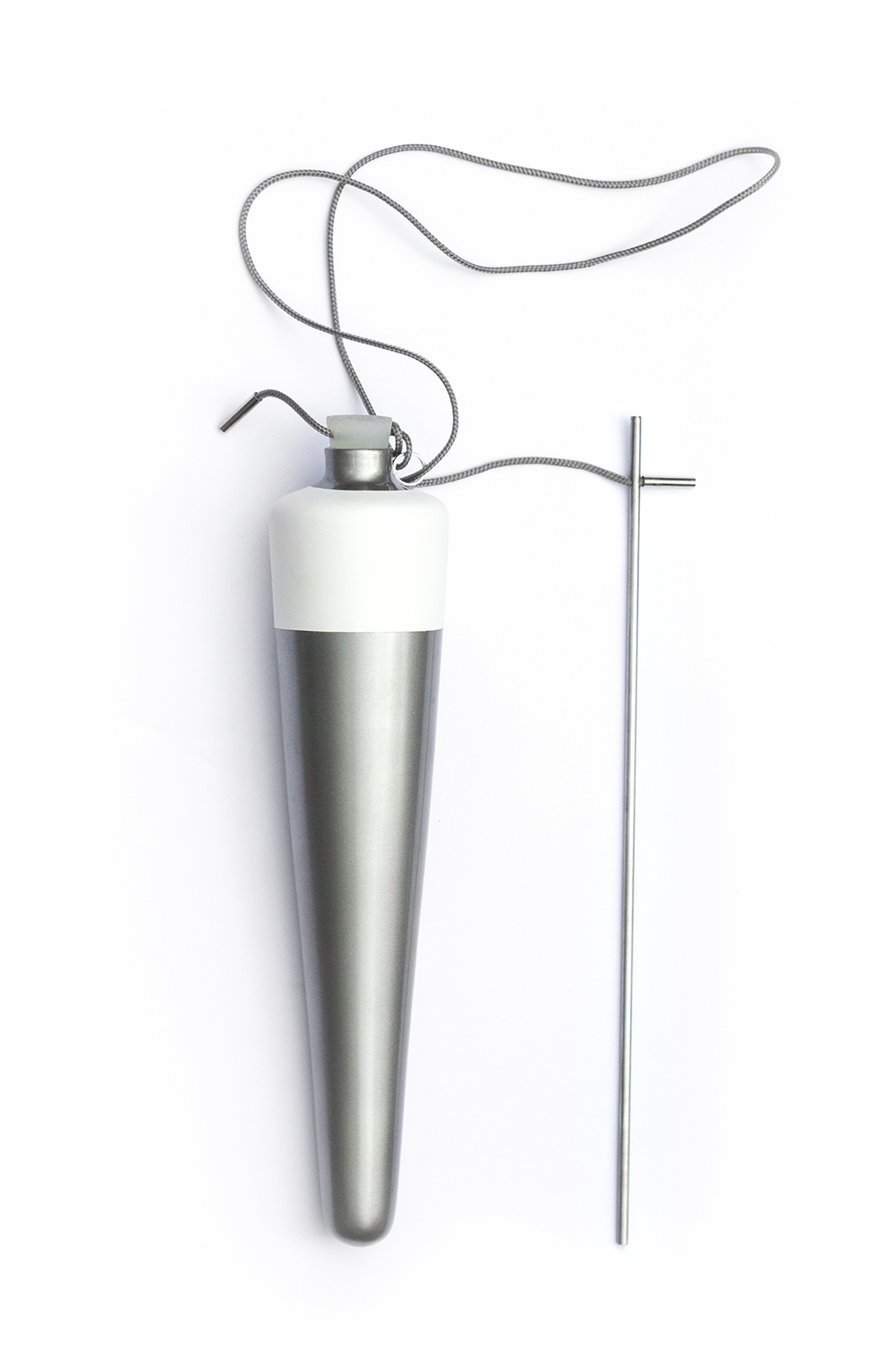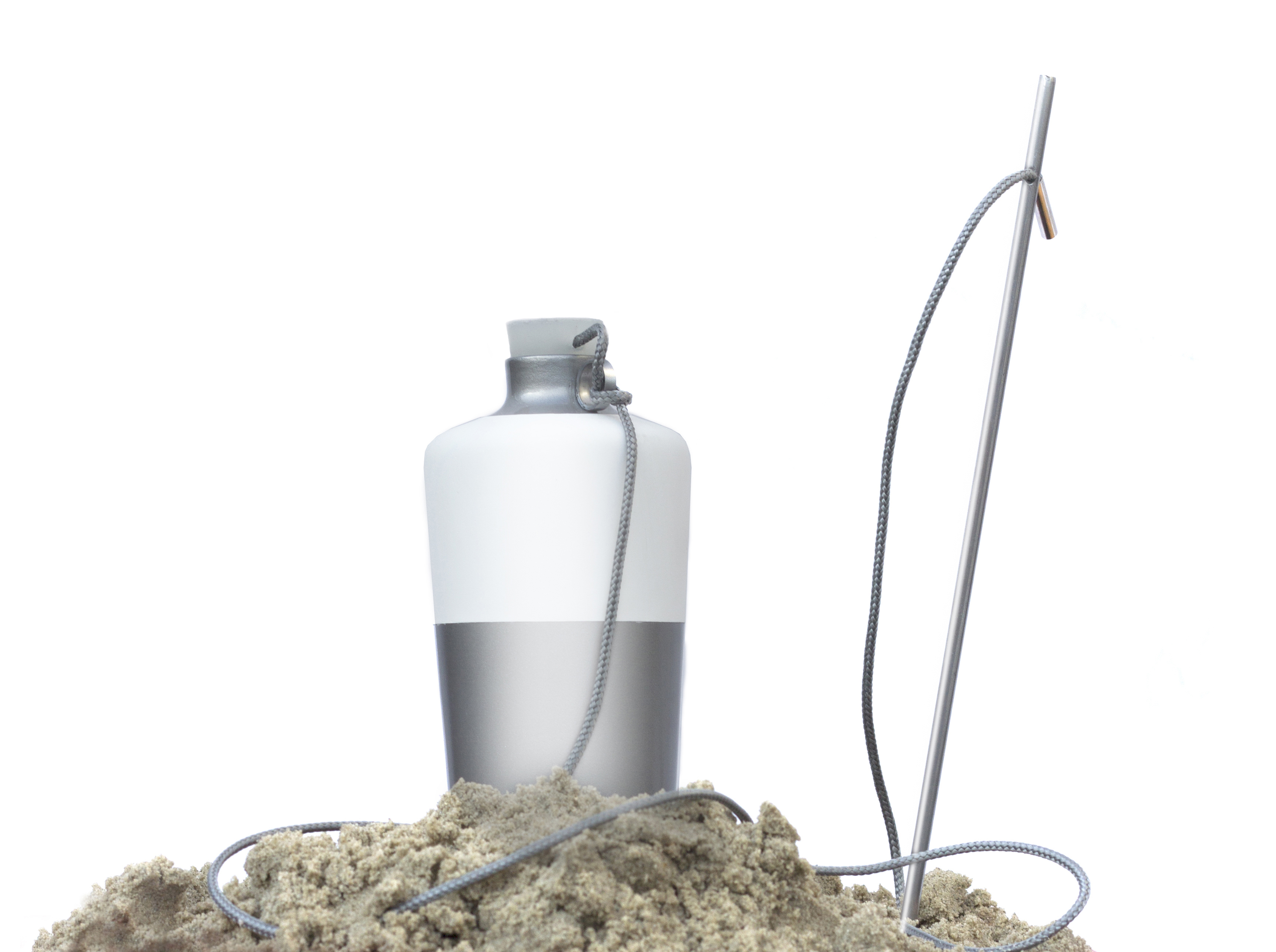 Keep cool on the beach Inspired by the various landscapes of Norwegian fjords, Vann answers the primary need for water in those environments but link it to the luxury of keeping it cold. In most of the environment, the ground as much as the sea is pretty good at keeping a constant and cool temperature, Vaan is using those two elements as coolers. Vann is composed of a container, a rope, and a stick. All those elements are dissociable and resistant. The bottle is made out of stainless steel with a Supertherm© paint (REF) coating on the top avoiding the bottle to get warmed by the sun. The two simples ways to cool the water is to use the thermal conductivity of the stainless steel by burying the bottle into the sand or attaching the rope or the stick to leave the bottle in the cold sea water. material: stainless steel, nylon rope, silicone, Supertherm© paint.
